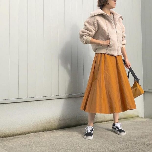 合わせているスカートも、ユニクロのアイテム。とても上下ユニクロコーデには見えません。スニーカーやサコッシュを合わせて、アクティブなコーデを完成させて。