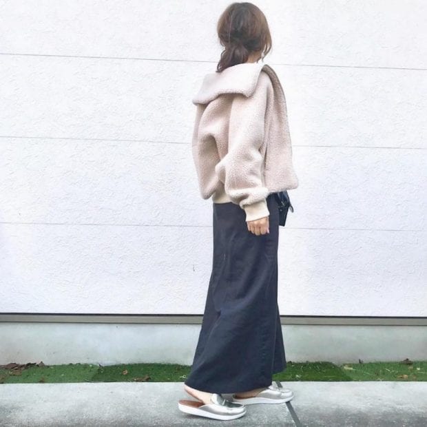 着膨れして見えることの多いオールホワイトのコーデもスタイリッシュな印象に。ふんわりとしたフリースの質感で、温かみのあるコーデが作れますよ。