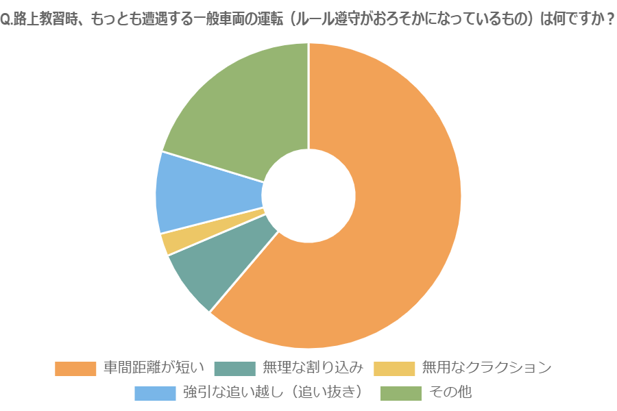 2番目に多かったのは、20.3%の「その他」。続く3位には、「強引な追い越し(追い抜き)」が8.7%でランクインしています。追い越しの際には、一時的でもスピードを出しすぎてしまうなども懸念されますよね。4位の「無理な割り込み」(7.4%)もそうですが、ほかの車も巻き込む可能性があることだから、どんなに急いでいても無理をするのは避けたいものです。