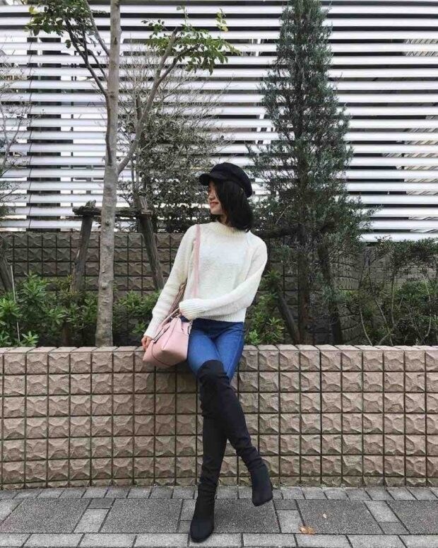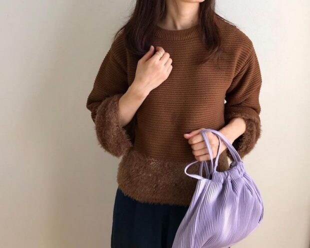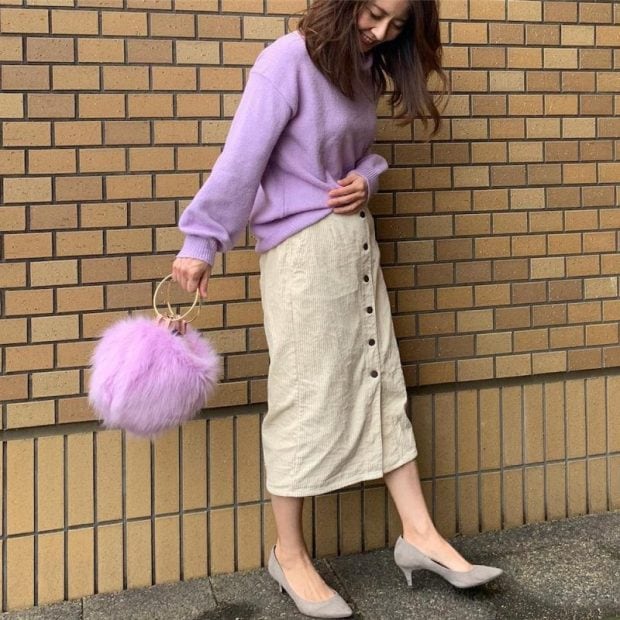 大人っぽいカラーのパープルも見逃せません。ゆるっとしたシルエットのニットだから、タイトスカートに合わせてバランスをとると◎。バッグや小物は同系色をチョイスすると、スッキリとした印象の着こなしを演出できます。