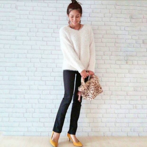 ふわりとした質感ながら着膨れ知らずのニットも登場! 質感でかわいらしさ、シルエットで女性らしさを叶えてくれる最強アイテムは、シンプルなコーデが映えます。ヘアはまとめ髪にすることで、スッキリ着ることができますよ。