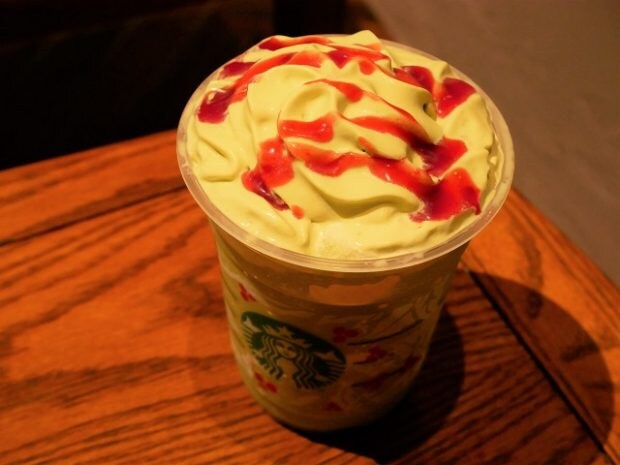 ピスタチオ風味の緑色のホイップと、真っ赤なラズベリーソースが、まるでクリスマスツリーのよう! 発売前から「飲むクリスマスツリー」と話題になっていました。