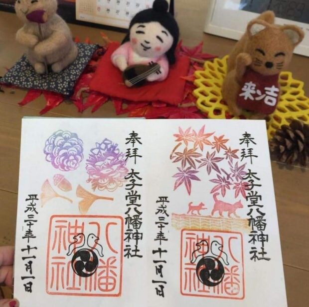 太子堂八幡神社では季節に合わせた風物や行事などを押印してくれます。写真は秋の雰囲気が満載です。キレイ目系の御朱印が好きな人に、おすすめしたいデザイン。