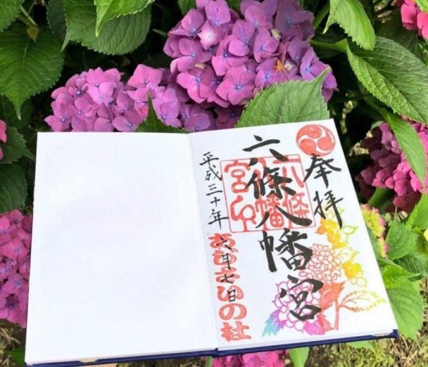 あじさいが有名な六條八幡宮。あじさい神社と呼ばれていることもあり、御朱印にも虹色のあじさいが描かれています。カラフルでとてもキレイですね!