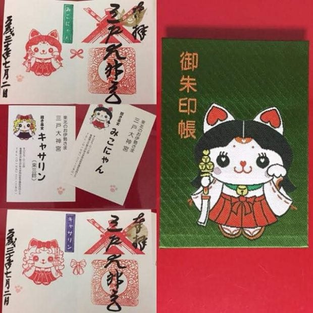 招き巫女のみこにゃんとキャサリン(来三鈴)が描かれている、とてもキュートな御朱印。おそろいの御朱印帳も合わせてほしくなっちゃいます。