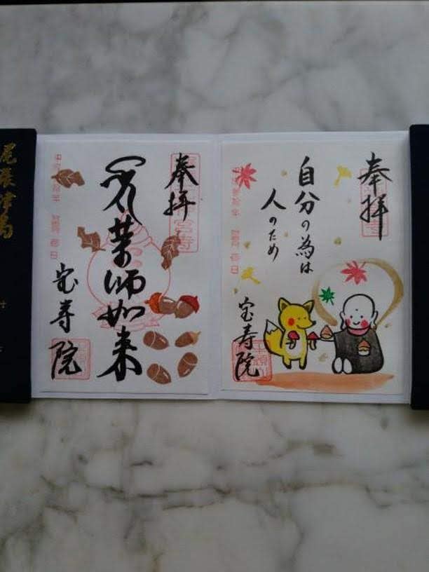 季節を感じるカラフルな絵柄が特徴的な宝寿院。仏様・お祖師様が描かれた御朱印や、月替わりの見開き絵も。書き置きのものと、直書きのものがあります。