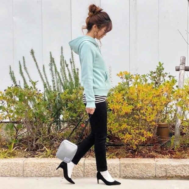 「カジュアルなパーカーは、春色を選んで華やかさを取り入れました。ボーダーのレイヤードでカジュアルダウンしていますが、足元は靴下×ヒールを合わせてレディ感を足しています」