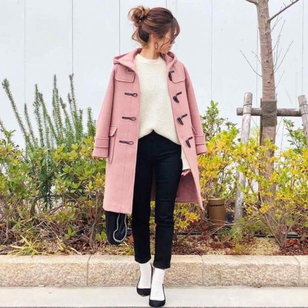 「モノトーンコーデにすると、ピンクダッフルの存在感が際立って、ダッフルを主役にしたコーデになります。一気に華やかになりますよね!」