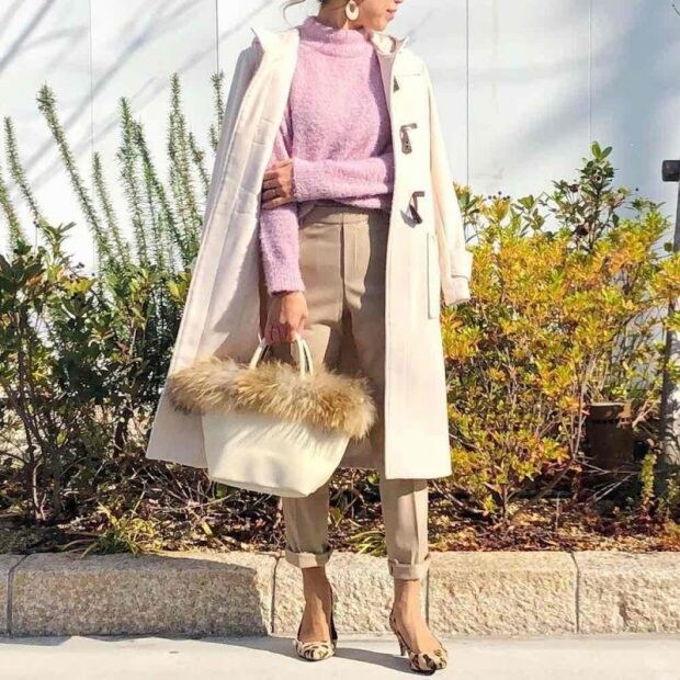 「優しい色合わせで女性らしさを演出したコーデです。ピンクのニットを主役に、ホワイトやベージュの馴染ませカラーを合わせました。足元のレオパード柄パンプスも優しいベージュがベースカラーとなっているものをチョイス。さらにファーバッグを取り入れて、柔らかいイメージにまとめています」