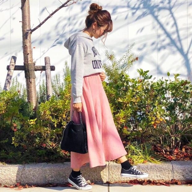 「GUのロゴスウェットは、ピンクのフレアスカートでレディ感をプラスしました。ヒールを合わせがちですが、あえてのスニーカーで頑張りすぎない大人なラフコーデを意識しています」