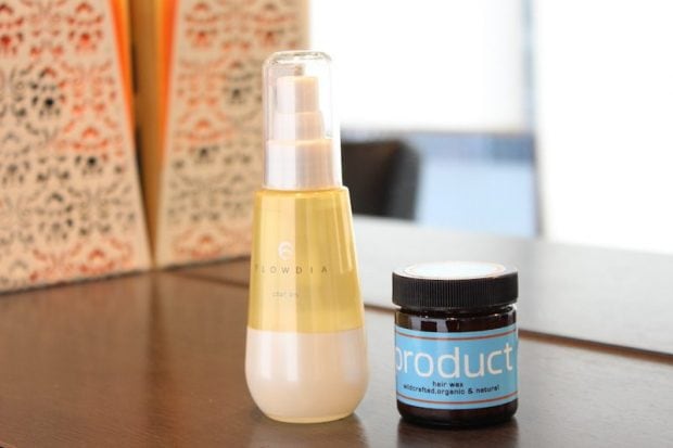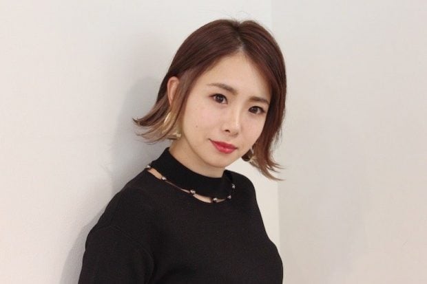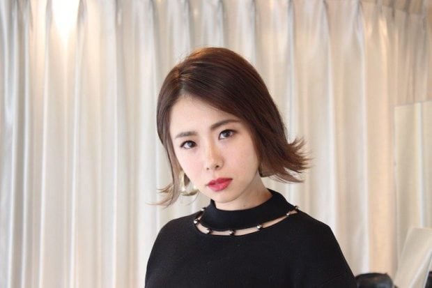 「ボブを外ハネにするとカッコ良さが出ますよね。ストレートアイロンで外ハネにし、オイルとヘアバームを1:1で取り、髪の毛全体に揉み込み、ツヤと程良いホールド感を与えています。思い切って額を出すのも、大人っぽさのポイントですね」