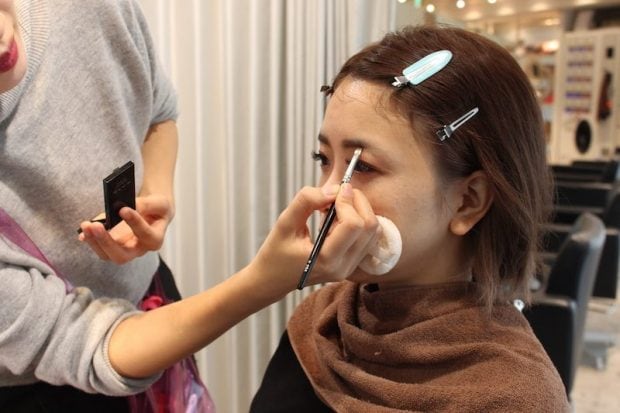 東海林さん「メイクのかなめになる眉は、眉と目の間を近づけることと、眉尻を下げないようにしっかり描くことで外国人っぽさが出せます。リップも色が強いので、アイシャドウやチークを薄くして、ケバくならないようにしました。目の上のアイラインはくっきりと。目が小さく見えるので目の下のラインはなしです」