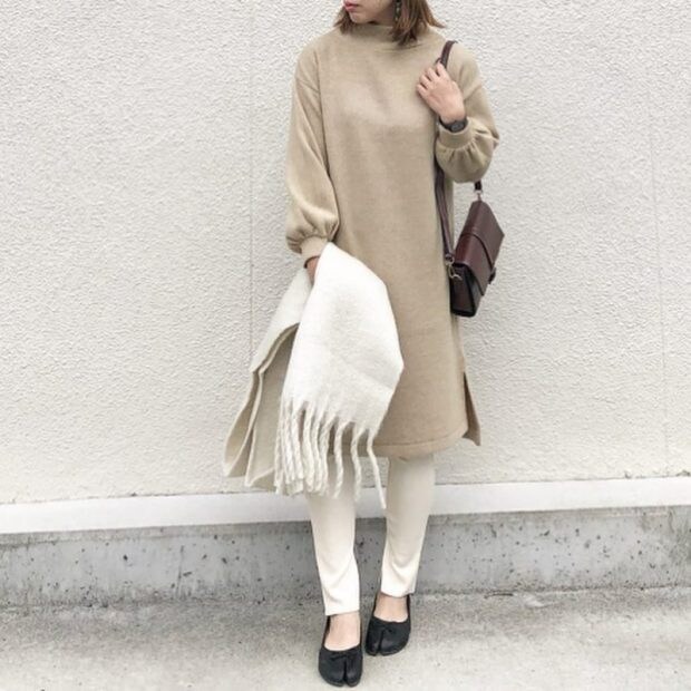 明るいカラーのレギンスは着太りして見えそう……と感じる方もいるかもしれませんが、ベージュのアイテムを軸に、レギンスが見える面積を狭くすることで、クリアできます。お互いのアイテムを引き立てつつ、さりげなくメリハリを演出してくれますよ。