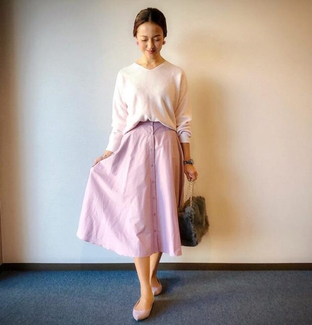 ベージュやアイボリーのワントーンコーデに飽きたら、春を先取りできる淡いピンクやラベンダーのスタイリングに挑戦してみて。
