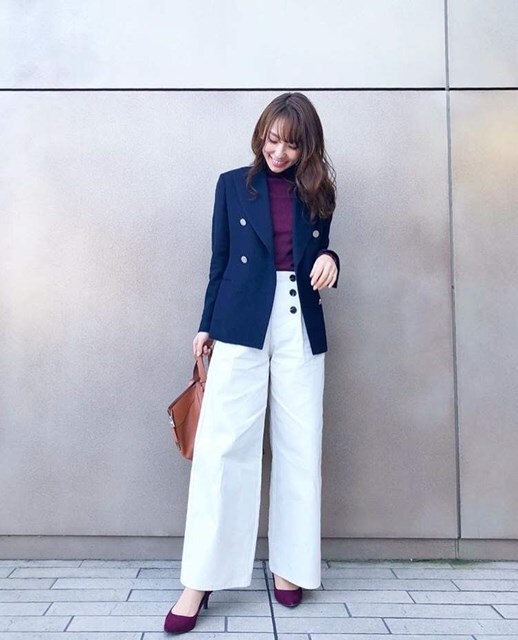 ジャケットと合わせれば、オフィスにもぴったりな清潔感溢れるコーデに。ジャケットの色をネイビーにすることで、よりマリンムードが高まり、かっちりしたコーデの中に遊び心がプラスされます♪ オンにもオフにも着回せるのが嬉しいですね!