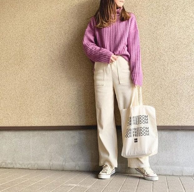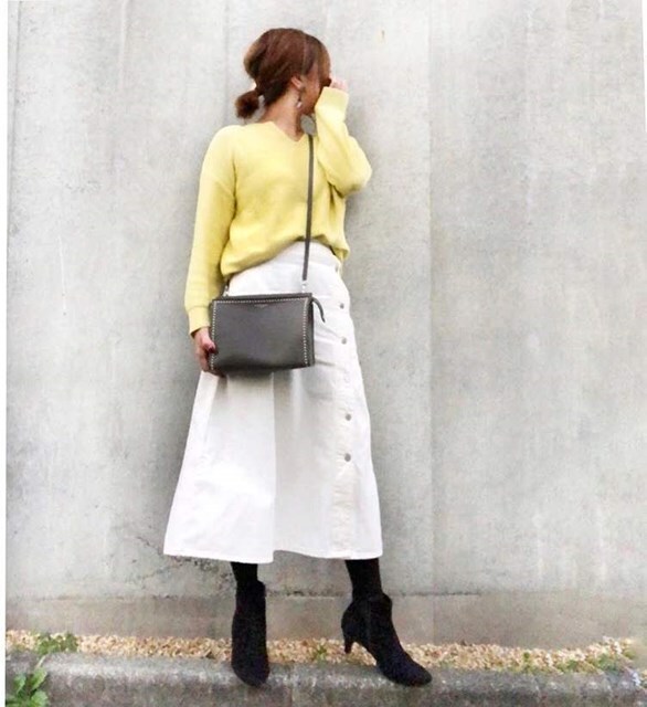 GUのキーネックセーターと合わせたコーデ。トップスとボトムスを明るい色でまとめれば、暗くなりがちな冬コーデが華やかに。パンプスやスニーカーと合わせてもかわいいですが、冬ファッションならアンクルブーツもおすすめ。ヒールで更に美脚効果アップ!