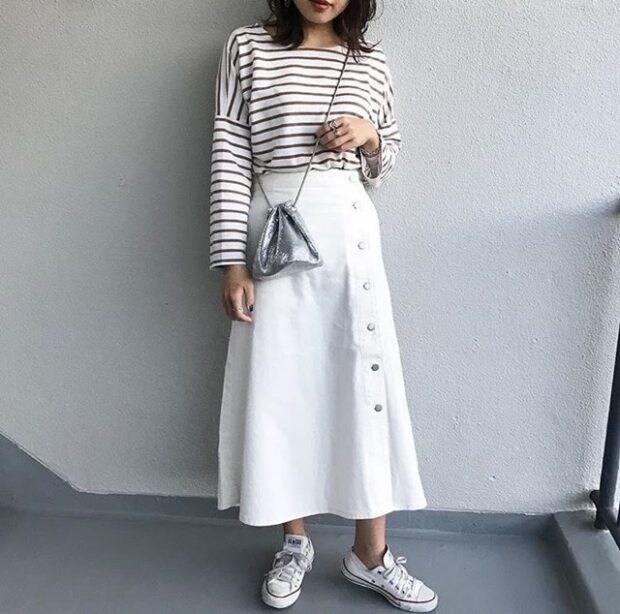 サイドボタンがアクセントの、デニムサイドボタンロングスカート(1,490円/税抜)。ホワイトカラーと足首がほどよく見えるロング丈で、コーデ全体の印象が重くなりすぎることなく、爽やかなに着こなせます。さらにウエスト部分はきゅっと締まって、裾にかけて広がるAラインのシルエットでスタイルアップ効果も◎!