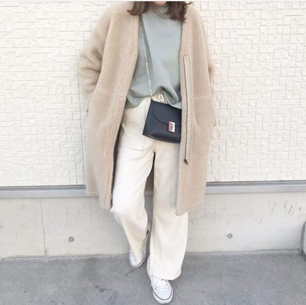 全体を淡い色でまとめて、カジュアルだけど女性らしい柔らかな印象のスタイリングに。今冬大人気のボアアウターと合わせれば、さらにトレンド感がプラスされます♪