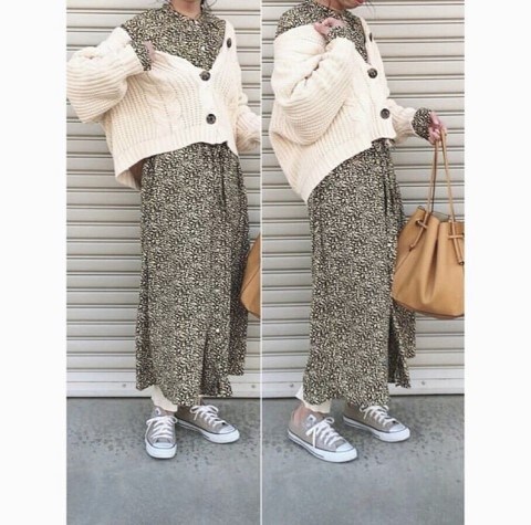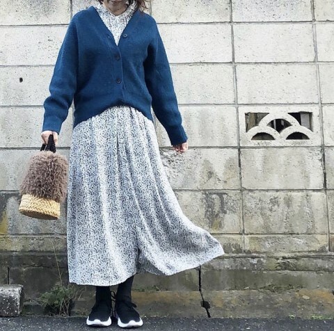 白地の花柄は、羽織るアイテムの色味を選ばず、着回しやすいカラー。カラーカーデを羽織ると、さりげなく華やかで、キャッチーな着こなしを楽しめますよ。