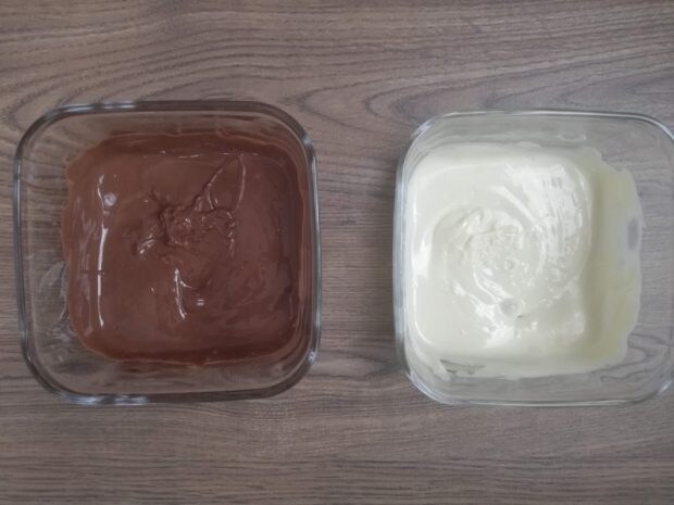 1.チョコレートをボウルまたは耐熱容器に入れ、湯せんやレンジで加熱して溶かします。レンジの場合は、600wで1分ほど加熱したあと取り出して混ぜ、チョコの塊がまだあるようなら10秒ずつ追加してまた混ぜます。レンジの場合、やりすぎるとチョコが焦げつく可能性があるため、少しずつ様子を見ながらやってくださいね。