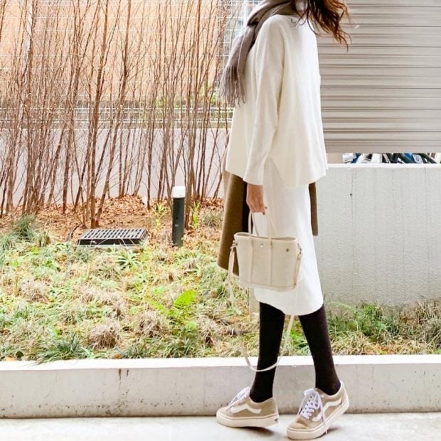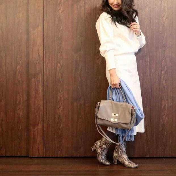 爽やかなオフホワイトは、夏まで使えそうなカラー。今の時期は、トレンドのワントーンコーデを楽しむのがオススメです。膨張して見えるのが不安なオフホワイトですが、ダークカラーのタイツを合わせるなど、色でメリハリをつけるとスッキリ着こなせます。