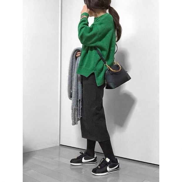 落ち着いたブラックデニムスカートは、カラーアイテムと相性抜群! グリーンのカーディガンを差し色にすれば、キャッチーなカジュアルコーデに。小ぶりのバッグを合わせれば、女性らしさを演出できます。