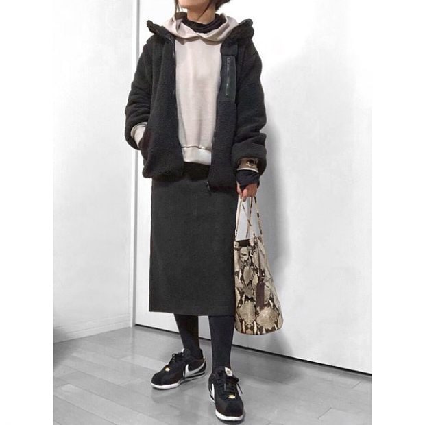 カジュアル色が強いパーカーとスニーカーを合わせた着こなしも、モノトーンならバランス良くキマりますね。