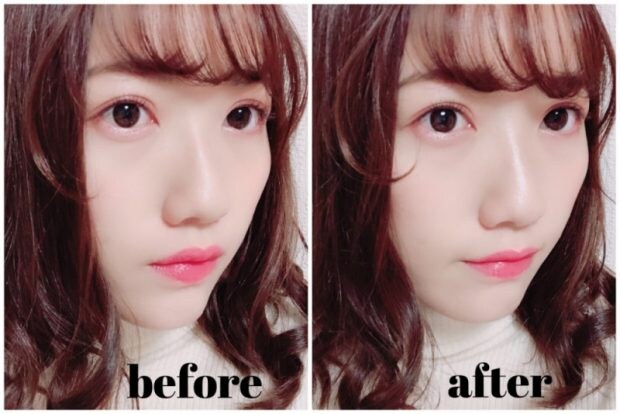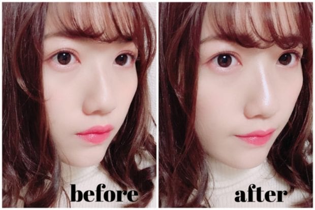 ▲(左)何も塗っていない状態(右)パールグロウハイライトを鼻筋にのせた状態
