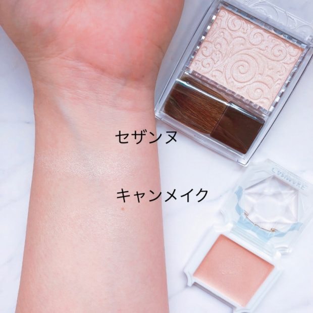 セザンヌはキャンメイクよりもパール感が強く、目立って見えます。パウダータイプなので、肌の状態によっては粉浮きしてしまう可能性もありそうですね……。