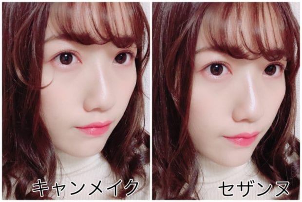 キャンメイクとセザンヌを、それぞれ鼻筋にのせた状態です。ツヤ感やナチュラルさなど、2つを同じ基準で評価してみました。
