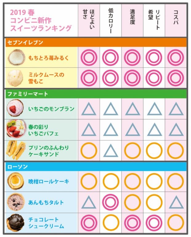 ▲ほど良い甘さか(甘すぎないか)、カロリーは控えめか、満足度は高いか、もう一度食べたいか、コスパが良いか……それぞれ5つの項目で、◎、〇、△の採点。