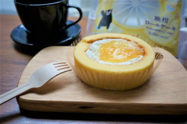 ▲熊本産柑橘「晩柑」の果汁&ピールとサワーミルククリームが入った 「貝印スイーツ甲子園 晩柑ロールケーキ」(210円/税込、236kcal)