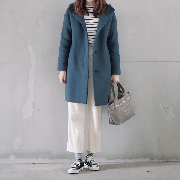 ロングコートとゆったりシルエットのホワイトのパンツと合わせて、大人っぽい着こなしに。トップスとコートをブルーでリンクさせたことで、統一感のあるコーデに仕上がっています。