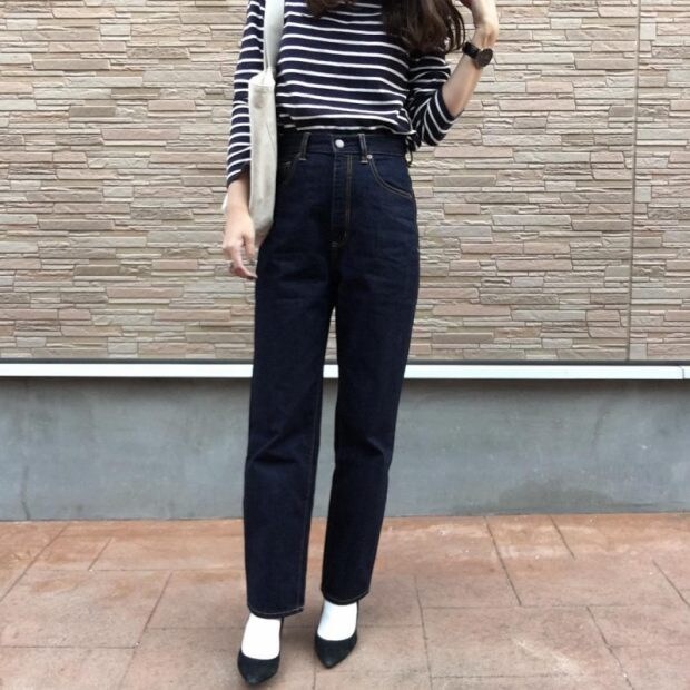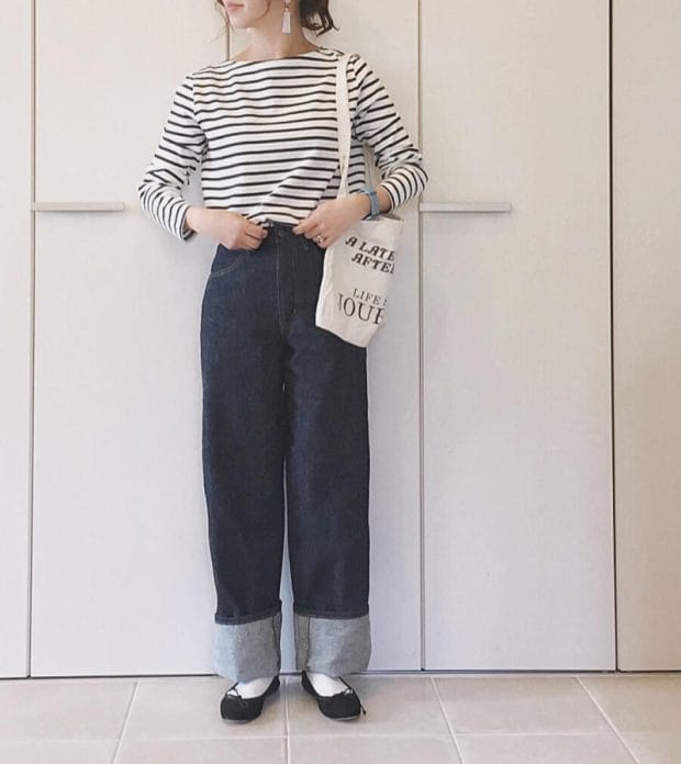 ハウイエストデニムを合わせれば、膨張が気になるボーダーもスタイルよく着こなせます。さらに、パンプスで女性らしさをプラスすると、カジュアルすぎずあか抜けた印象に。