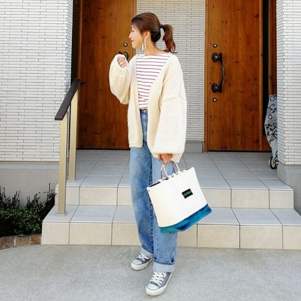 春らしい赤と白のボーダーは、ゆったりシルエットのカーディガンを羽織って優しげな雰囲気をプラス。ひとつ女性らしいアイテムを取り入れるだけで、ボーダー×デニムのボーイッシュな印象を和らげてくれます。