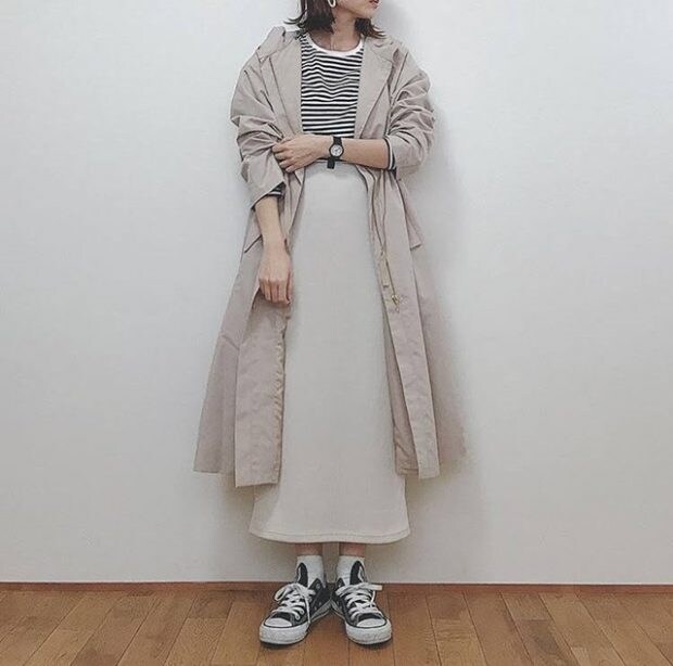 ボーダーにスニーカーと、カジュアルなアイテムを合わせて。ロング丈の美ラインのスカートが、カジュアルな中にも女性らしさを演出してくれます。