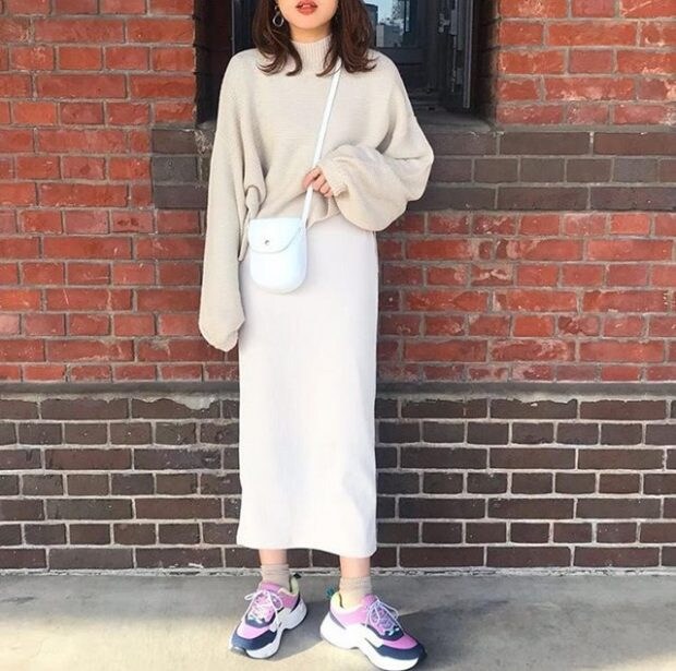 細見えが叶うアイテムだから、柔らかいナチュラルカラーでまとめたワントーンコーデも、膨張を気にせず楽しめます。バルーンスリーブでボリューム感のあるトップスにタイトなスカートを合わせて、メリハリのあるスタイリングに。足元はダッドスニーカーで、今年らしいトレンド感をプラスして。