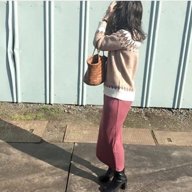 まだ肌寒い日は、ほっこりとした柄がかわいいセーターやブーツと合わせて。ピンクカラーなら、冬アイテムと合わせても重くならず、明るい印象を与えてくれます。更にはリブ素材で軽やかさを、タイトなシルエットで着やせ効果も期待できますよ。