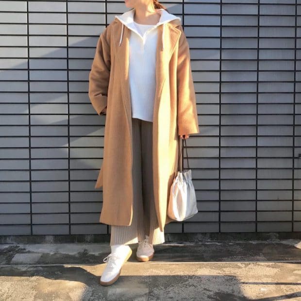 ボトムスはニットパンツを合わせて、ゆるっとした大人のラフコーデを完成させてみて。定番のパーカも、ワッフル素材だと新鮮に映りますね。