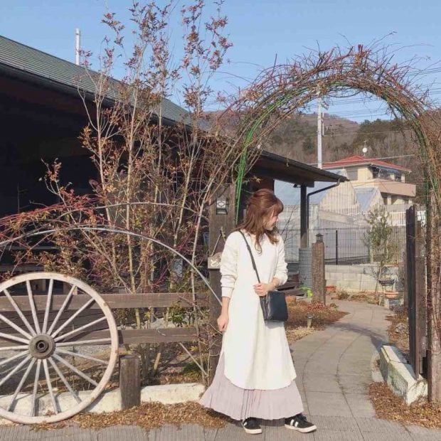GUのワッフルスリットワンピースは、見た目が似ているユニクロのワッフルクルーネックワンピースより、長めの丈感が特徴のアイテム。プリーツスカートをチラ見せさせると、スリットデザインを活かした魅力的な着こなしに。トレンド感のあるレイヤードテクなので、ぜひ試してみて。