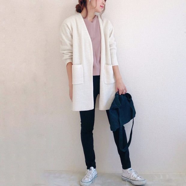 くすんだピンクのトップスと合わせれば、大人かわいいカジュアルコーデに仕上がります。