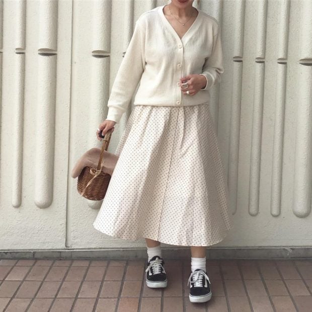同系色のスカート×スニーカーを合わせて、大人カジュアルなお出かけコーデを楽しんで。