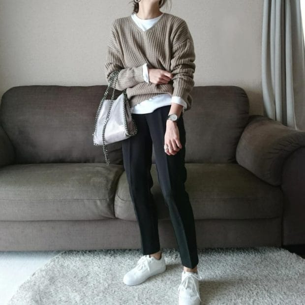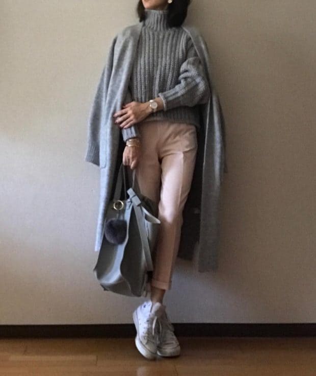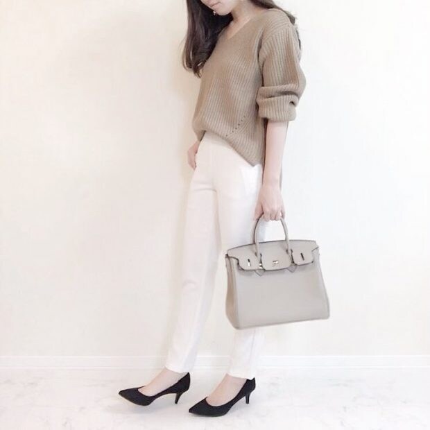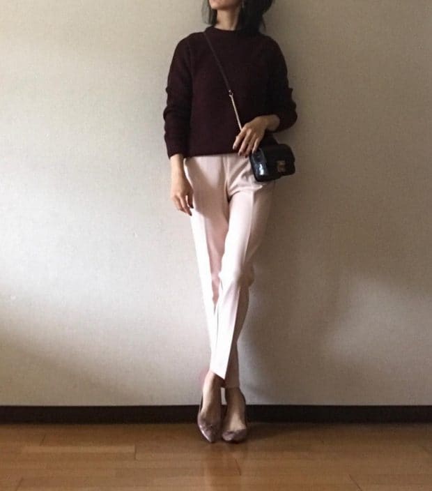 淡いカラーのニットとパンプスを合わせて、美人見えコーデに。身頃にゆとりのあるトップスと合わせれば、ボトムスがスッキリ見えてスタイルアップ効果も期待できます。