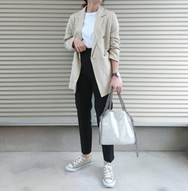 オーバーサイズのジャケットを合わせて、上品な大人カジュアルコーデに。テーラードジャケットは、軽く袖をまくって、手首を出すとこなれ感がアップ。あか抜けた着こなしが叶います。