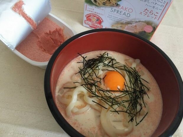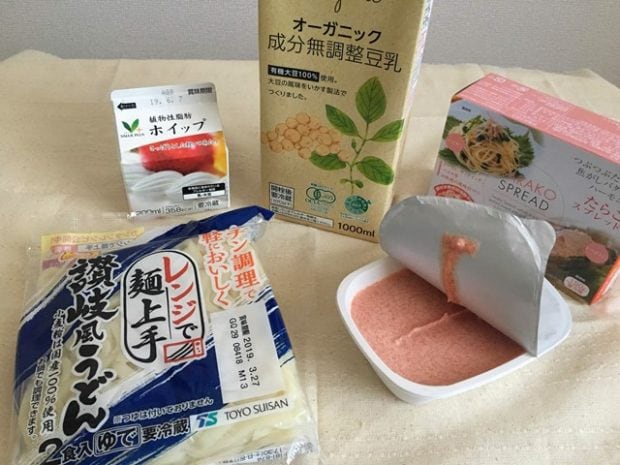 材料は、うどん、生クリーム、豆乳、めんつゆ、たらこスプレッド。今回は電子レンジでチンするだけで食べられるうどんを使用しました。