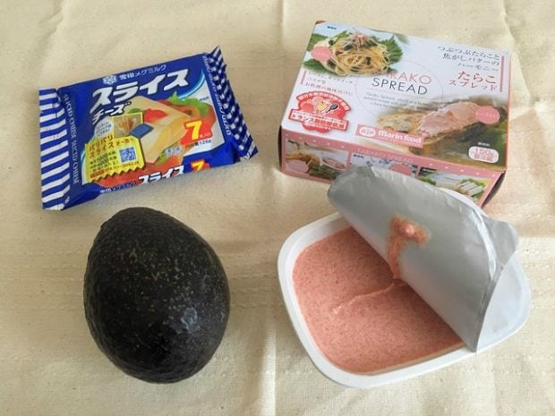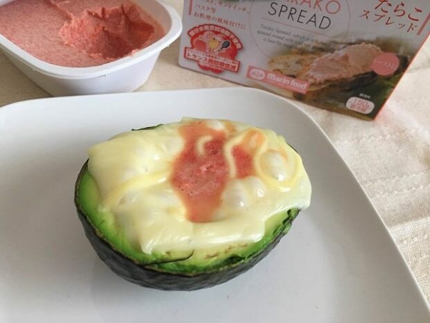 材料はアボカド、スライスチーズ、そしてたらこスプレッドのみ。アボカドを半分に切ったら、その上にスライスチーズ、たらこスプレッドをのせて、トースターグリルで約2分焼くだけ。あっという間に完成です。