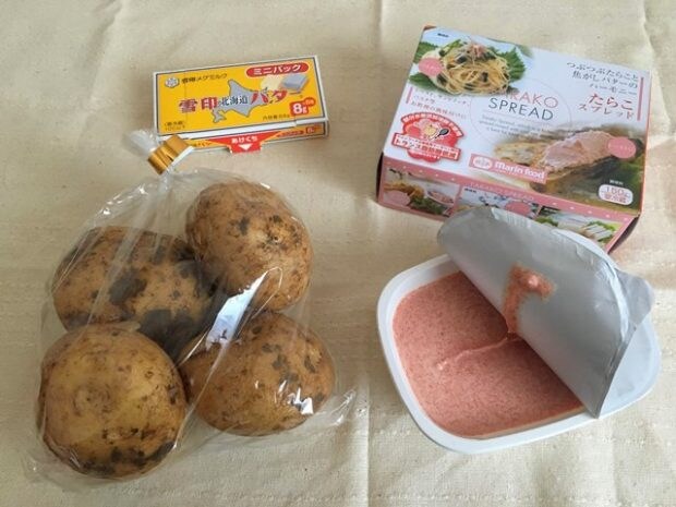 材料はじゃがいも、バター、たらこスプレッドの3つ。じゃがいもは皮をよく洗い泥を落としたら、ラップにくるんで電子レンジでチンするだけ。目安としては、500wで3分加熱したら、ひっくり返して更に2分加熱します。