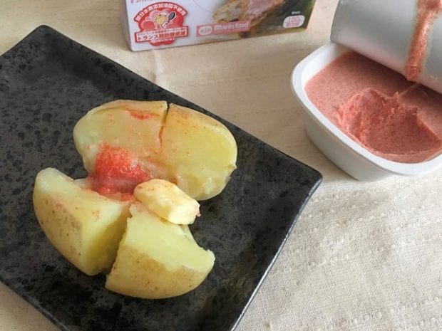 じゃがいもに火が通って柔らかくなったら十字に切り、たらこスプレッドとバターをのせて完成です。じゃがいものほくほくとした素材の味を引き立てながら、たらことバターの旨味がふわっと口中に広がります。