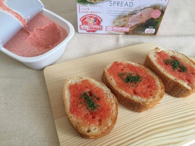 用意するものは、たらこスプレッドとパンのみ。今回はフランスパンを使ってみました。パンにスプレッドを塗ったら、後はトースターで焼いてできあがりです。仕上げにパセリを散らすと、さらに彩りが良くなりますよ。