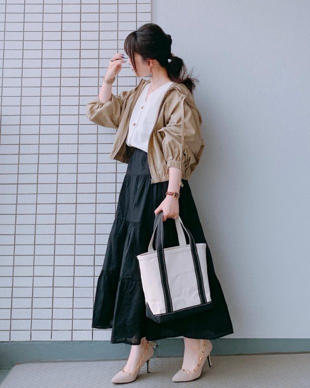 ティアードとは「重なった」という意味で、生地が何段にも切り替えられたスカートのことを指します。ふんわりとしたシルエットのスカートは、体型をカバーしつつもフェミニンな印象に見せてくれるアイテム。